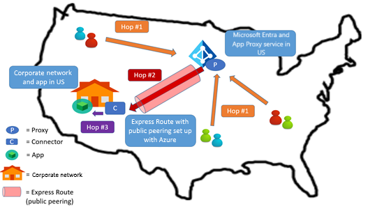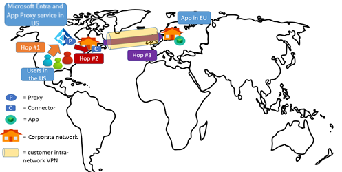 Poiché gli utenti europei accedono a un'istanza del proxy dell'applicazione che si trova nella stessa regione, il primo hop non è costoso. L'hop 3 è ottimizzato. È consigliabile usare ExpressRoute per ottimizzare l'hop 2.