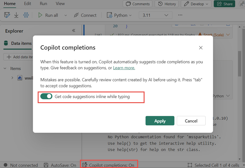 I notebook Fabric sono integrati nell'editor Monaco e consentono di aggiungere la funzionalità IntelliSense di tipo IDE all'editor di celle. L'evidenziazione della sintassi, il generatore di errori e i completamenti automatici del codice consentono di scrivere codice e identificare i problemi rapidamente.