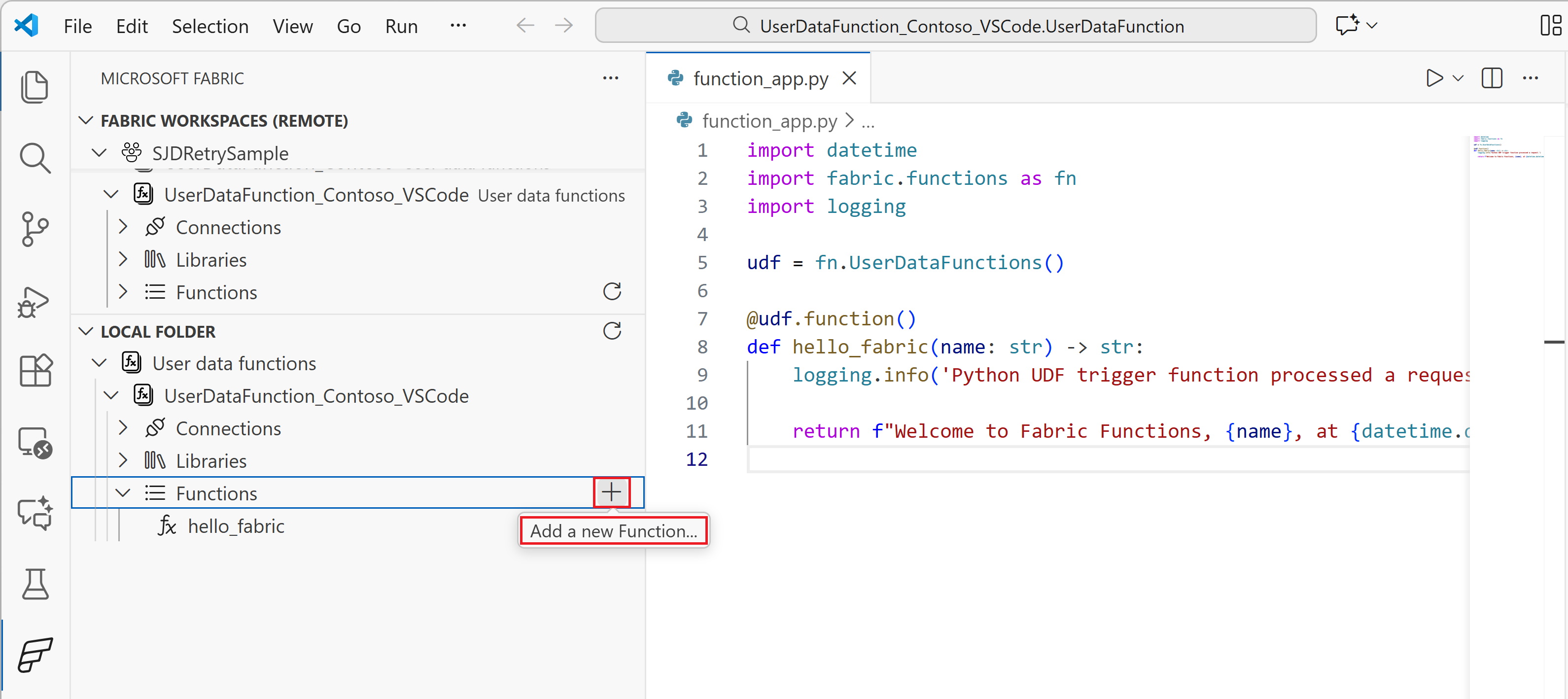 function_app.pyper visualizzare la funzione predefinitahello_fabric. È possibile modificare questa funzione o aggiungere altre funzioni.@udf.function() def hello_fabric(name: str) -> str: # Use logging to write custom logs to help trace and debug issues logging.info('Python UDF trigger function processed a request.') logging.info('Executing hello fabric function.') return f"Welcome to Fabric Functions, {name}, at {datetime.datetime.now()}!"