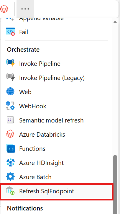 Cercare Aggiorna endpoint SQL nel riquadro Attività pipeline e selezionarlo per aggiungerlo all'area di disegno della pipeline.
