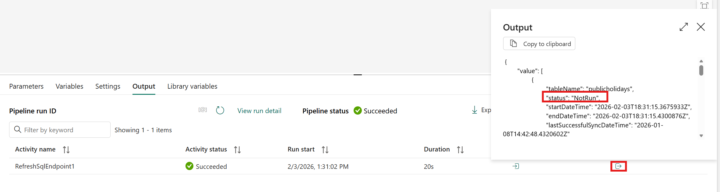 Lo stato NotRun nel popup Output indica che l'aggiornamento dell'endpoint SQL non è stato eseguito. Questa condizione significa in genere che non sono stati aggiunti nuovi dati dall'ultima sincronizzazione, quindi non è necessario eseguirlo.