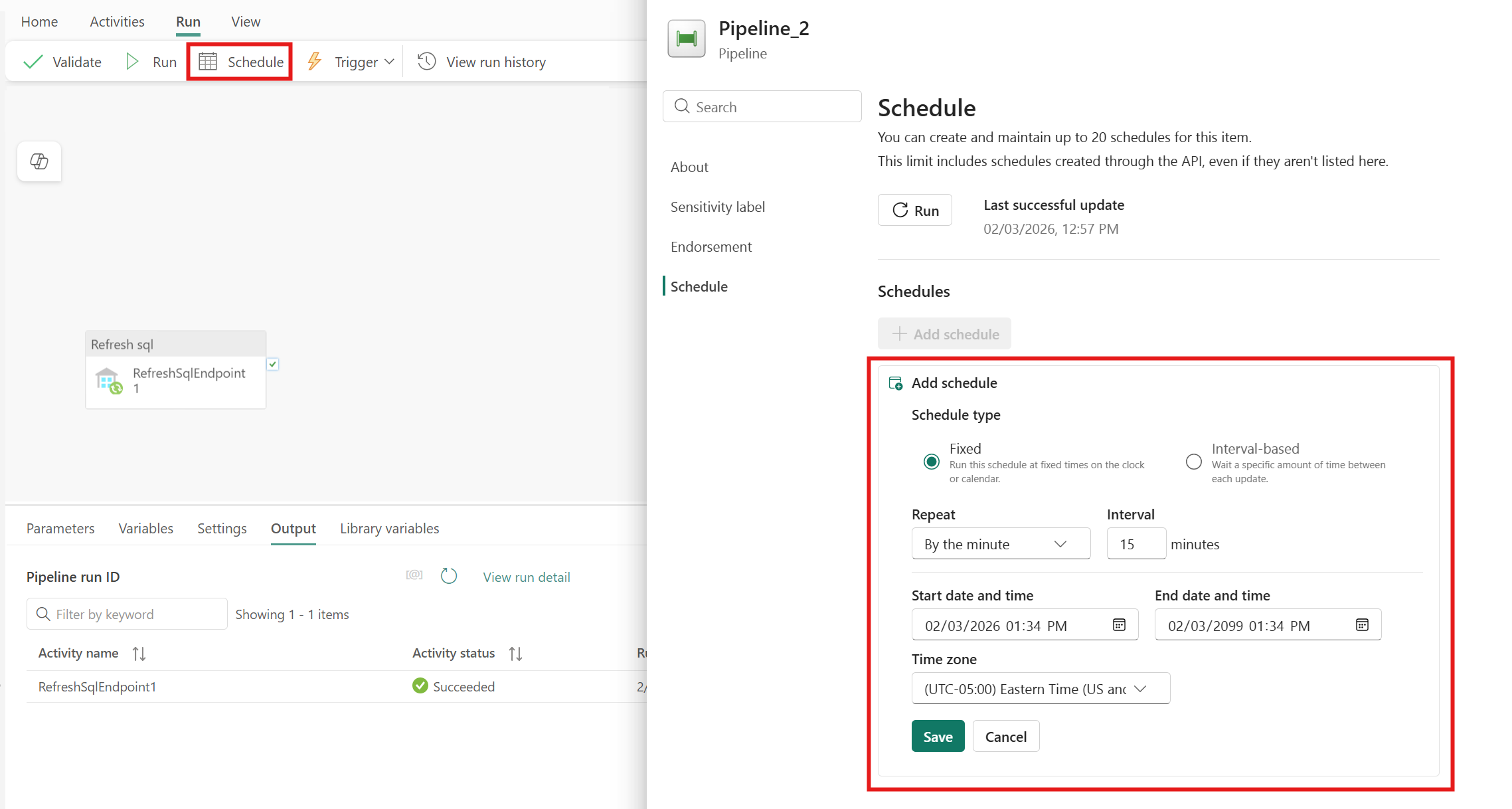 - Pianificare un aggiornamento ogni 15 minuti, in modo continuo. Alcuni tentativi di aggiornamento potrebbero non riuscire a causa del blocco, ma abbastanza ne riescono per rendere l'endpoint SQL relativamente aggiornato.