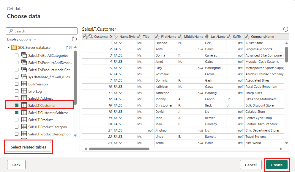 Selezionare i dati da trasformare, ad esempio SalesLT.Customer e selezionare le tabelle correlate per includere tabelle correlate. Successivamente, seleziona Crea.