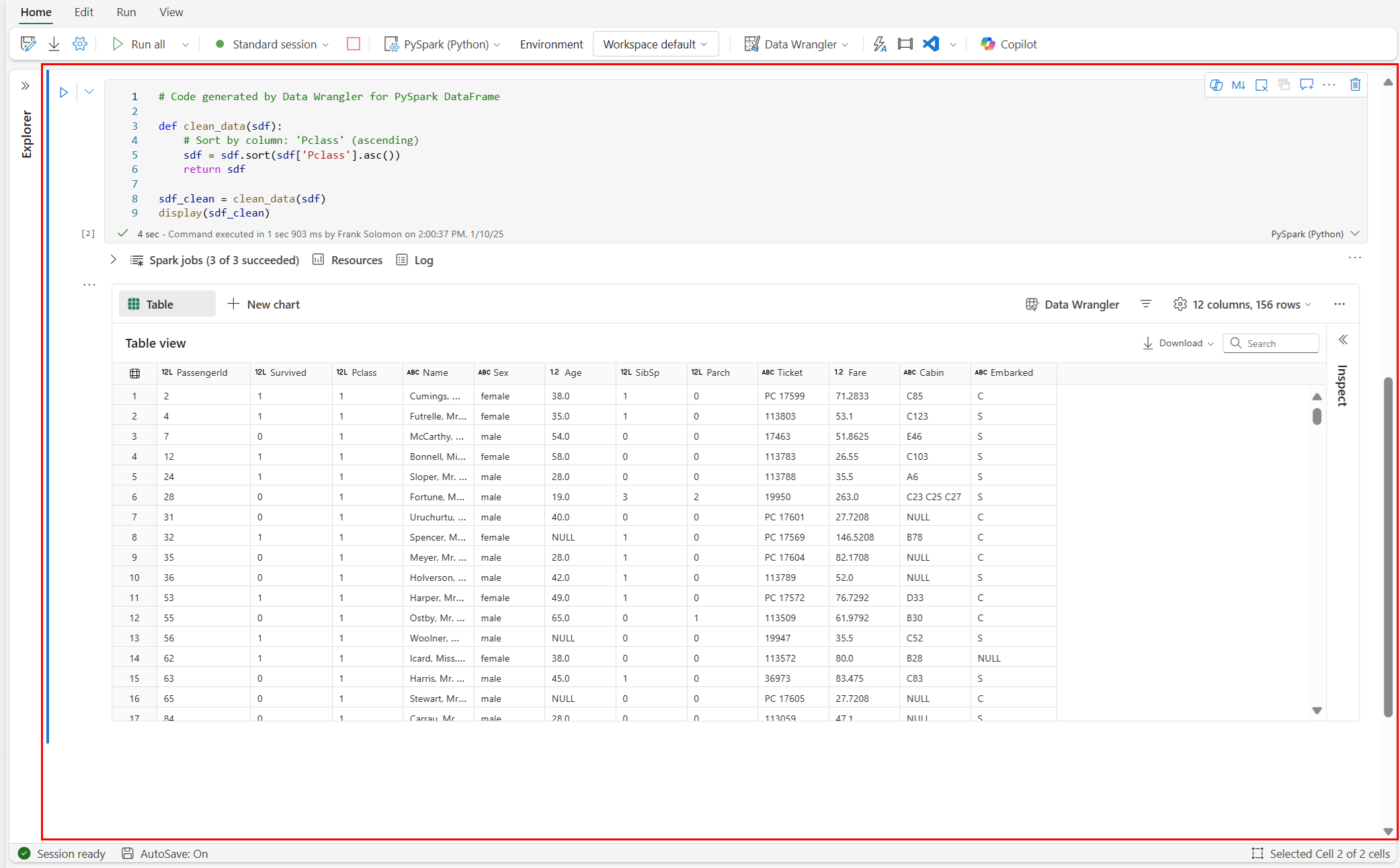 Data Wrangler genera codice che viene applicato solo quando si esegue manualmente la nuova cella e non sovrascriverà il tuo DataFrame originale, come illustrato in questo screenshot: