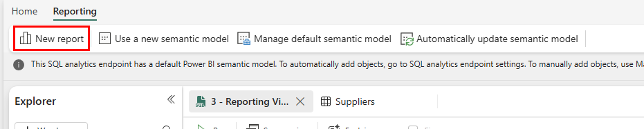 All'interno della visualizzazione endpoint di analisi SQL è disponibile un'opzione di menu per La creazione di report. Ora creerai un report in base alle viste che hai creato nell'endpoint di analisi SQL in un passaggio precedente dell'esercitazione.