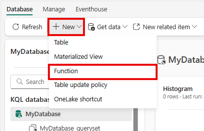 Passare al database KQL e selezionare Nuova>funzione. Il
