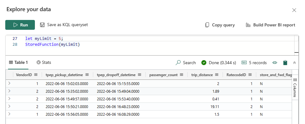 .create-or-altercomando viene visualizzato automaticamente nella finestra Esplora i dati .Immettere il nome della funzione e i parametri di query per la funzione anziché il testo segnaposto e quindi selezionare Esegui.