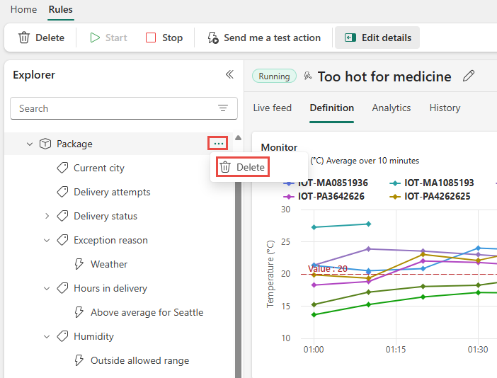 Selezionare Inizio. In questo modo la regola diventa attiva. Viene visualizzato un messaggio di Teams ogni volta che un pacchetto di medicina è troppo caldo. La regola deve essere attivata più volte ogni ora.