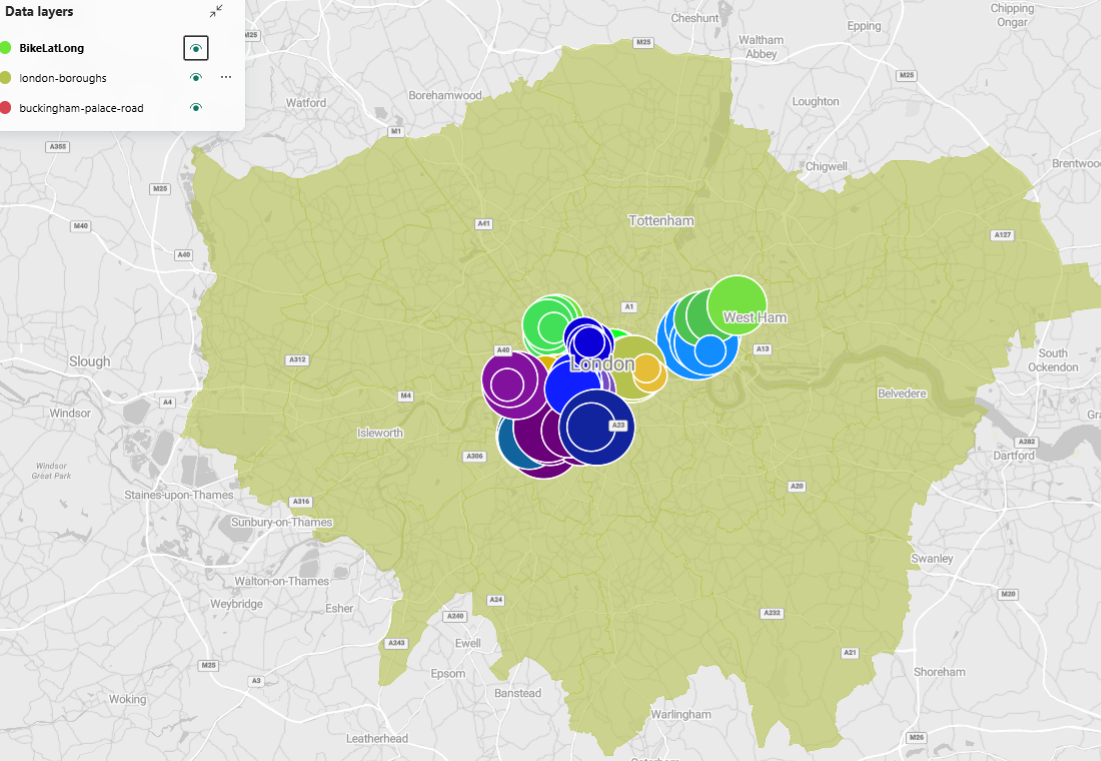 Fare clic con il pulsante destro del mouse su BikeLatLong in Livelli dati e scegliere Zoom per adattarsi all'area di Londra che mostra le stazioni di bicicletta sulla mappa.