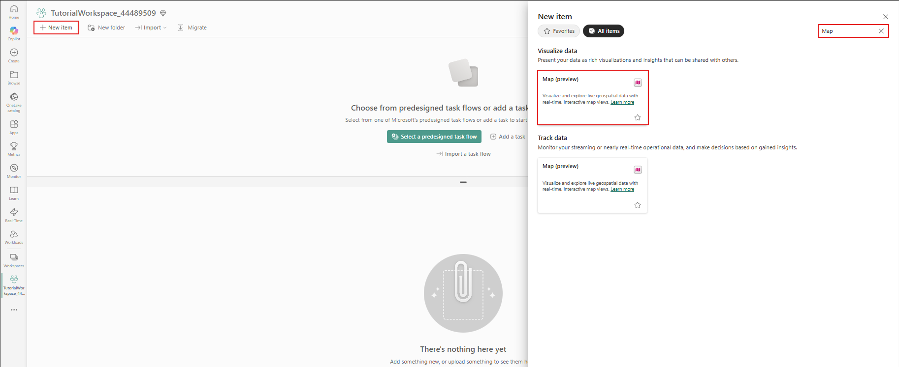 Passare all'area di lavoro e nell'angolo superiore sinistro selezionare il pulsante + Nuovo elemento . Cercare quindi e selezionare Mappa.