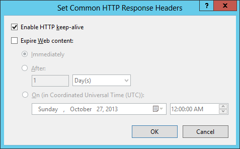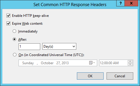 Nella finestra di dialogo Imposta intestazioni di risposta HTTP comuni selezionare la casella per la scadenza del contenuto Web, selezionare l'opzione per scadere dopo un intervallo specifico o in un momento specifico e quindi fare clic su OK.