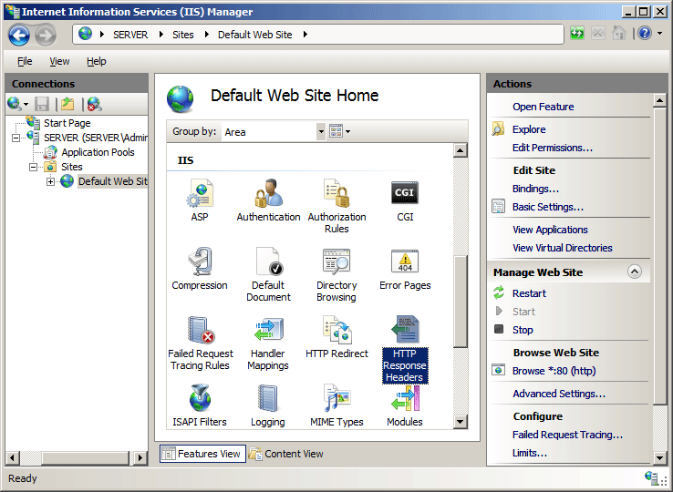Nel riquadro Intestazioni risposta HTTP fare clic su Imposta intestazioni comuni ... nel riquadro Azioni .