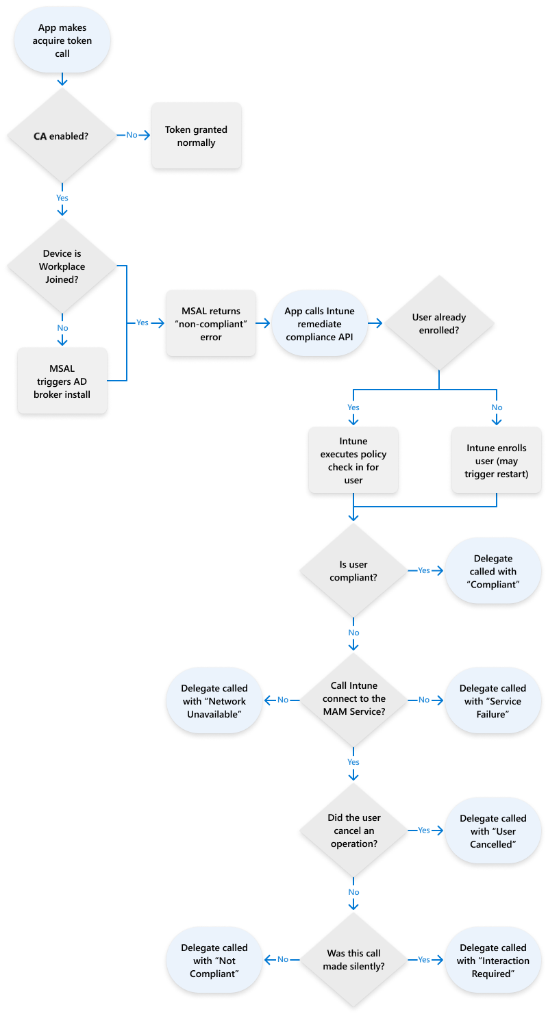 | App → Intune SDK: Call remediateComplianceForIdentity | Quando un'app riceve un ERROR_SERVER_PROTECTION_POLICY_REQUIRED da ADAL o MSALErrorServerProtectionPoliciesRequired da MSAL, deve chiamare [[Istanza di IntuneMAMComplianceManager] remediateComplianceForIdentity] per consentire Intune registrare l'app e applicare i criteri. L'app potrebbe essere riavviata durante questa chiamata. Se l'app deve salvare lo stato prima del riavvio, può farlo nel metodo delegato restartApplication in IntuneMAMPolicyDelegate. remediateComplianceForIdentity fornisce tutte le funzionalità di registerAndEnrollAccount e loginAndEnrollAccount. Pertanto, l'app non deve usare nessuna di queste API meno recenti. |