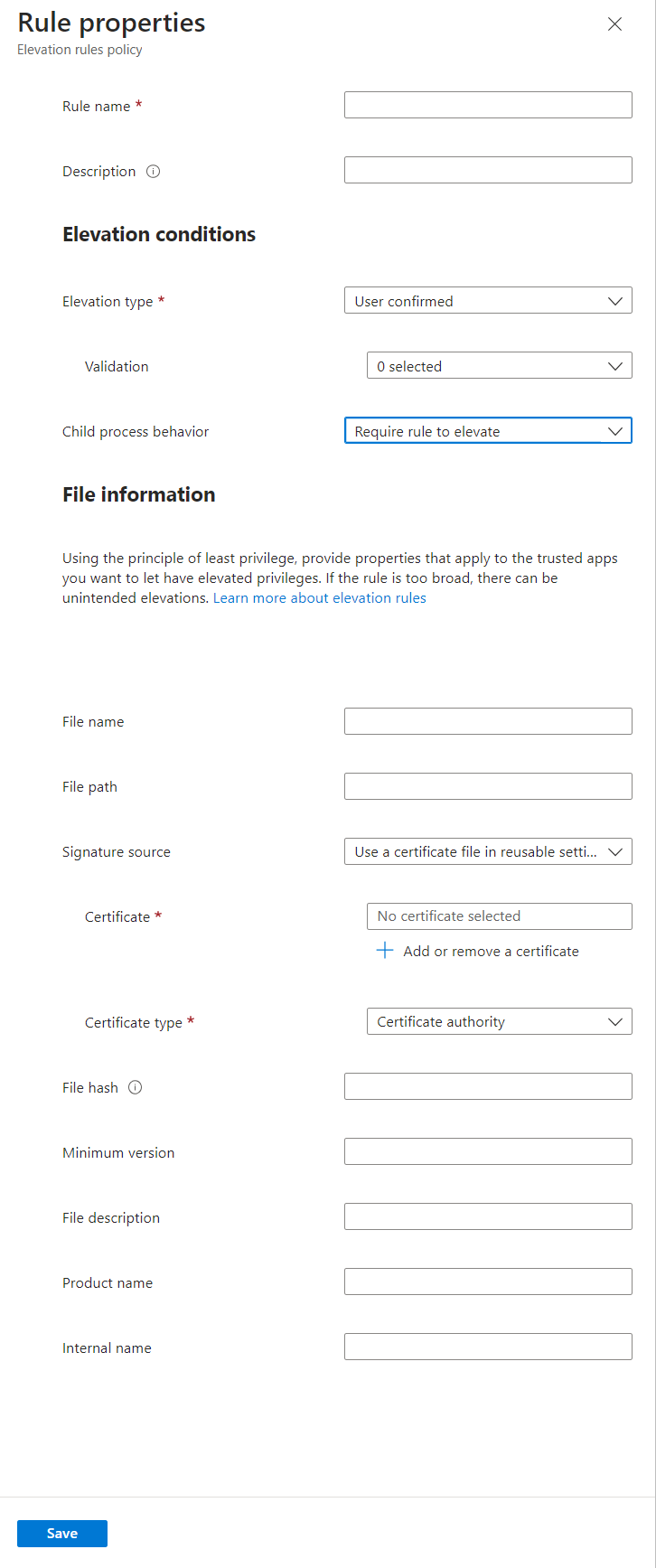 In Impostazioni di configurazione aggiungere una regola per ogni file gestito da questo criterio. Quando si crea un nuovo criterio, il criterio viene avviato include una regola vuota con un tipo di elevazione utente confermato e nessun nome di regola. Per iniziare, configurare questa regola e in seguito è possibile selezionare Aggiungi per aggiungere altre regole a questo criterio. Ogni nuova regola aggiunta ha un tipo di elevazione utente confermato, che può essere modificato quando si configura la regola.