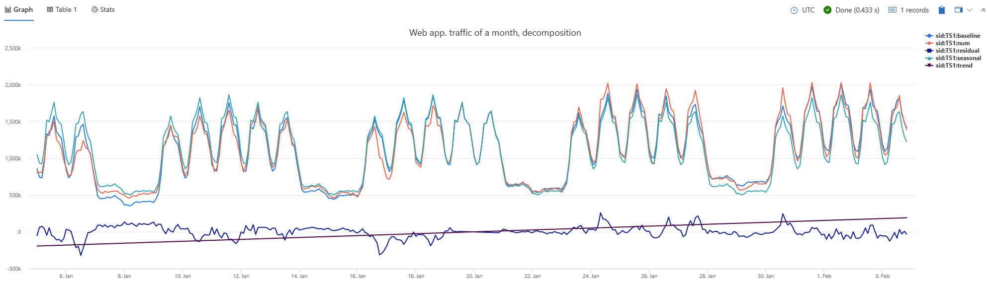 | render timechart with(title='Web app. traffic over a month, decomposition')