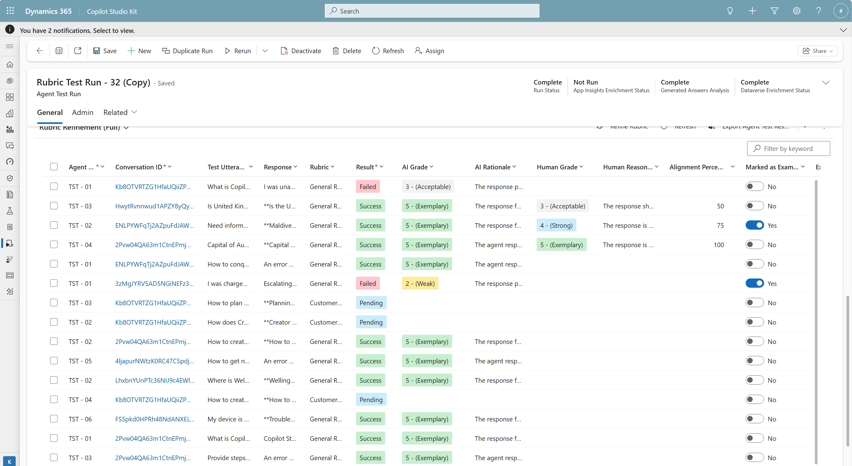 Il primo passaggio consiste nel configurare ed eseguire un'esecuzione di test in modalità di perfezionamento della rubrica, che consente la classificazione dell'intelligenza artificiale con la rubrica definita. Durante questa esecuzione, il sistema genera valutazioni di intelligenza artificiale e motivazioni per ogni caso di test di risposta generativa, ma non calcola lo stato di superamento o di esito negativo poiché stai ancora affinando il criterio di valutazione.