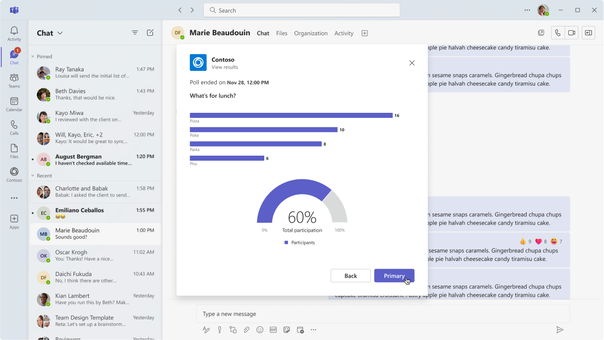 This example shows poll results launched from an Adaptive Card. The poll can be placed inside a dialog, too.