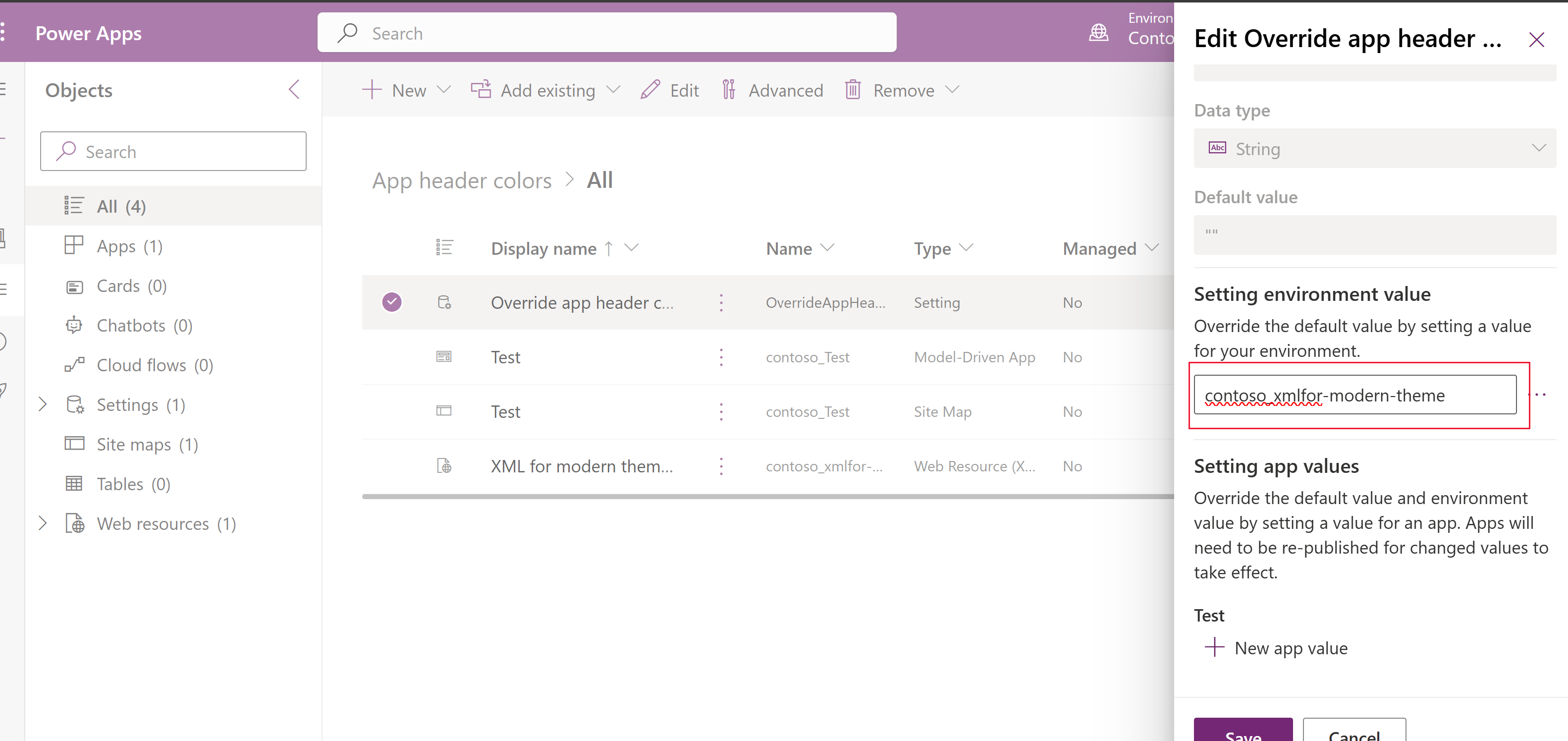 - Nel riquadro delle proprietà Modifica definizione tema personalizzato a destra, seleziona Nuovo valore di ambiente in Impostazione del valore di ambiente e immetti il nome univoco della risorsa web creata in precedenza (osserva la colonna Nome nella soluzione per il nome univoco). Rimuovi le virgolette doppie e assicurati di aggiungere il prefisso dell'editore per la risorsa web. Ad esempio, il nome potrebbe essere visualizzato come contoso_green-custom-theme come in questo esempio.