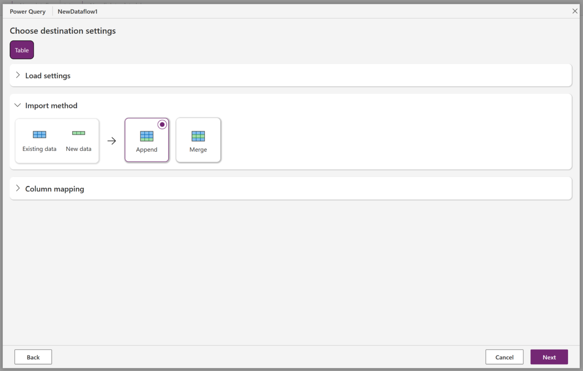 1. In Impostazioni di caricamento selezionare Carica in una nuova tabella.