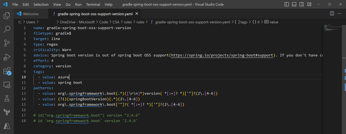 Screenshot di Visual Studio Code con il file delle regole aperto.