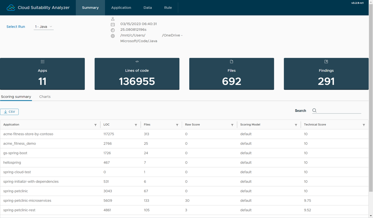 È possibile trovare l'elenco delle applicazioni con il rispettivo punteggio tecnico nella pagina Riepilogo del report di valutazione. La pagina di riepilogo elenca anche altre informazioni, ad esempio righe di codice e numero di file analizzati.