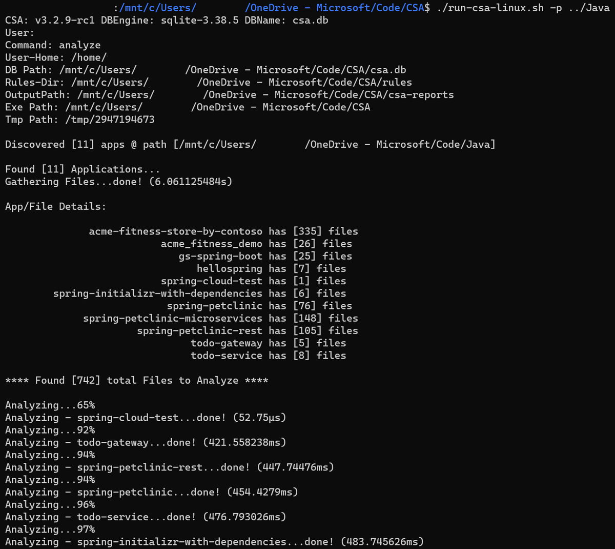 La directory <src_dir> contiene diverse sottodirectory con il codice sorgente dell'app Spring. Questa operazione analizza tutti questi progetti in un'esecuzione e archivia i risultati in un file denominato csa.db. Le analisi successive archiviano i risultati nello stesso file csa.db .