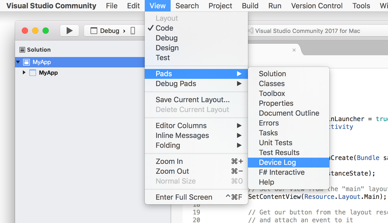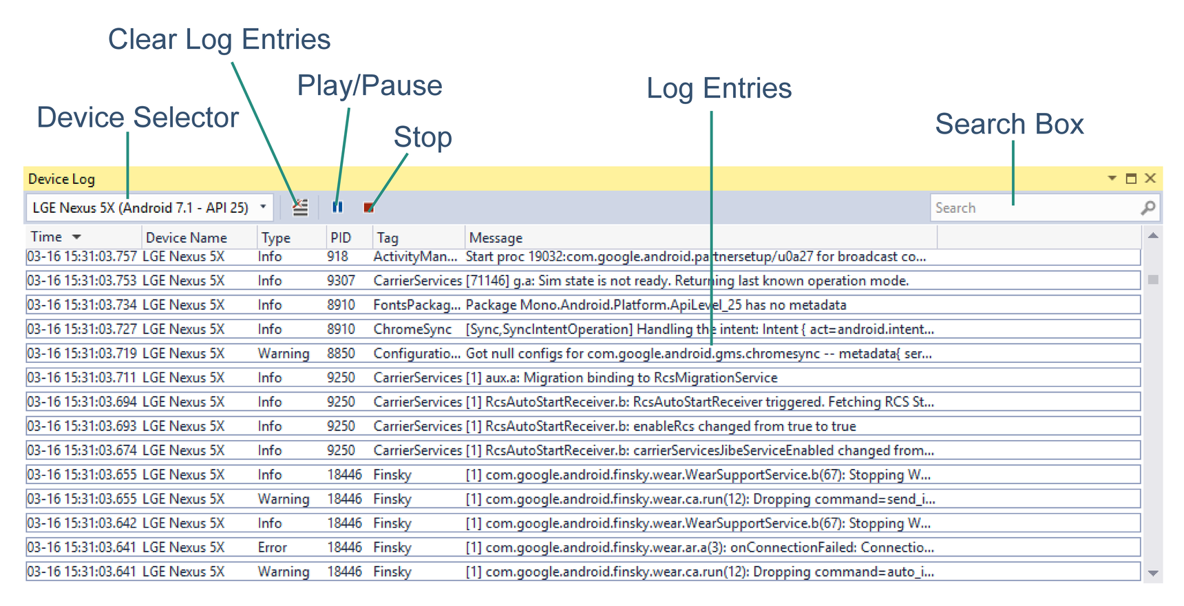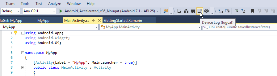Un espediente piuttosto comune a cui ricorrono gli sviluppatori per il debug delle proprie applicazioni sono le chiamate a Console.WriteLine. In una piattaforma per dispositivi mobili come Android, tuttavia, la console non è disponibile. I dispositivi Android specificano un log che è possibile usare durante la scrittura delle app. Questo log viene a volte indicato come logcat a causa del comando digitato per recuperarlo. Usare la strumento Log di debug per visualizzare i dati registrati.