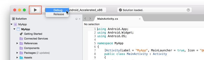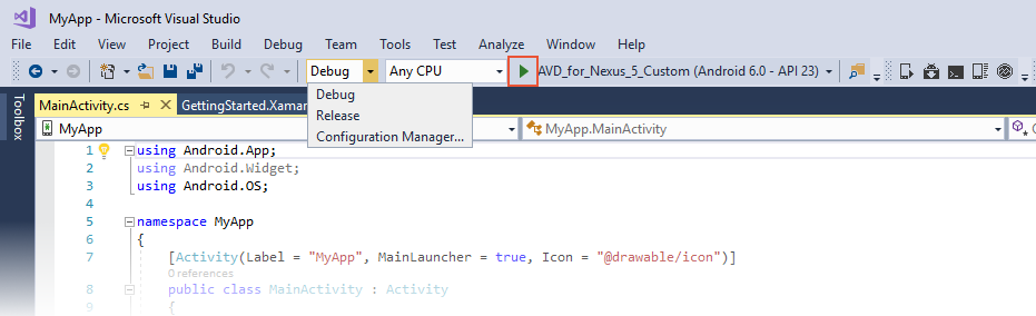 Nella parte superiore di Visual Studio è disponibile un menu a discesa che consente di selezionare la modalità Debug o Versione. Se si sceglie la modalità Debug, il debugger viene collegato al processo dell'applicazione in esecuzione all'interno dell'emulatore dopo l'avvio dell'app. Se si sceglie la modalità Versione, il debugger viene disabilitato (tuttavia, è comunque possibile eseguire l'app e usare le istruzioni di registrazione per il debug). Dopo aver scelto un dispositivo virtuale dal menu a discesa dei dispositivi, selezionare la modalità Debug o Versione e quindi fare clic sul pulsante Esegui per eseguire l'applicazione: