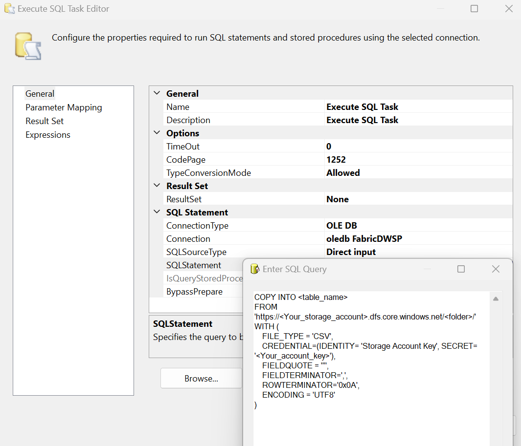 È consigliabile usare il comando T-SQL nativo COPY INTO per un inserimento efficiente dei dati nel warehouse in Microsoft Fabric. Sostituire tutte le operazioni DFT che attualmente si basano sulla modalità inserimento rapido o sugli script con l'istruzione COPY INTO utilizzando l'Execute SQL Task.