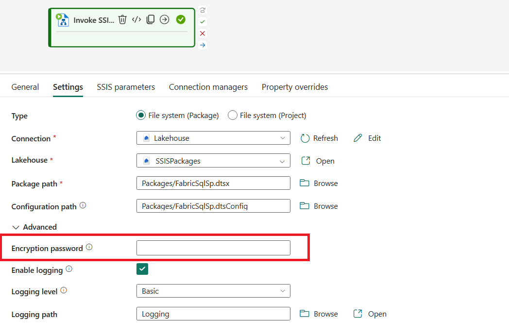 Quando si esegue in Fabric con l'attività Invoke SSIS Package, se il pacchetto usa il livello di protezione DontSaveSensitive, le credenziali non vengono mantenute nel file del pacchetto. È possibile specificarli in fase di esecuzione tramite la scheda Gestioni connessioni dell'attività Richiama pacchetto SSIS. In alternativa, è possibile impostare il livello di protezione del pacchetto su EncryptSensitiveWithPassword, che crittografa le credenziali all'interno del pacchetto. Specificare quindi la password del pacchetto nell'attività Richiama pacchetto SSIS in fase di esecuzione anziché specificare le singole credenziali della gestione connessione.
