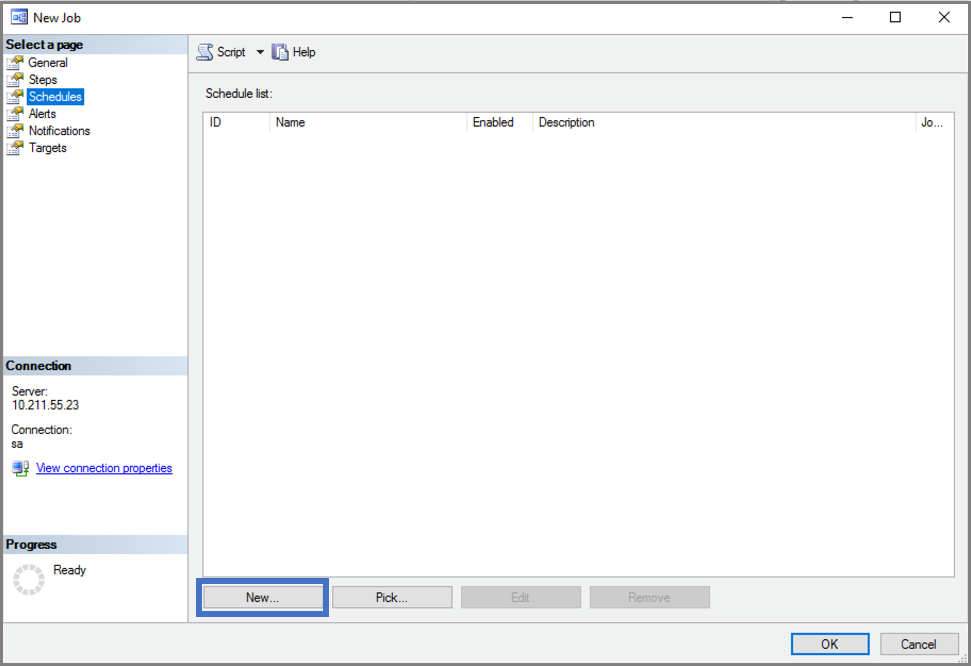 -- Sets the 'Daily' schedule to the 'Daily SampleDB Backup' Job EXECUTE sp_attach_schedule @job_name = N'Daily SampleDB Backup', @schedule_name = N'Daily SampleDB'; GOUsare sp_add_jobserver per assegnare il processo a un server di destinazione. In questo esempio la destinazione è il server locale.