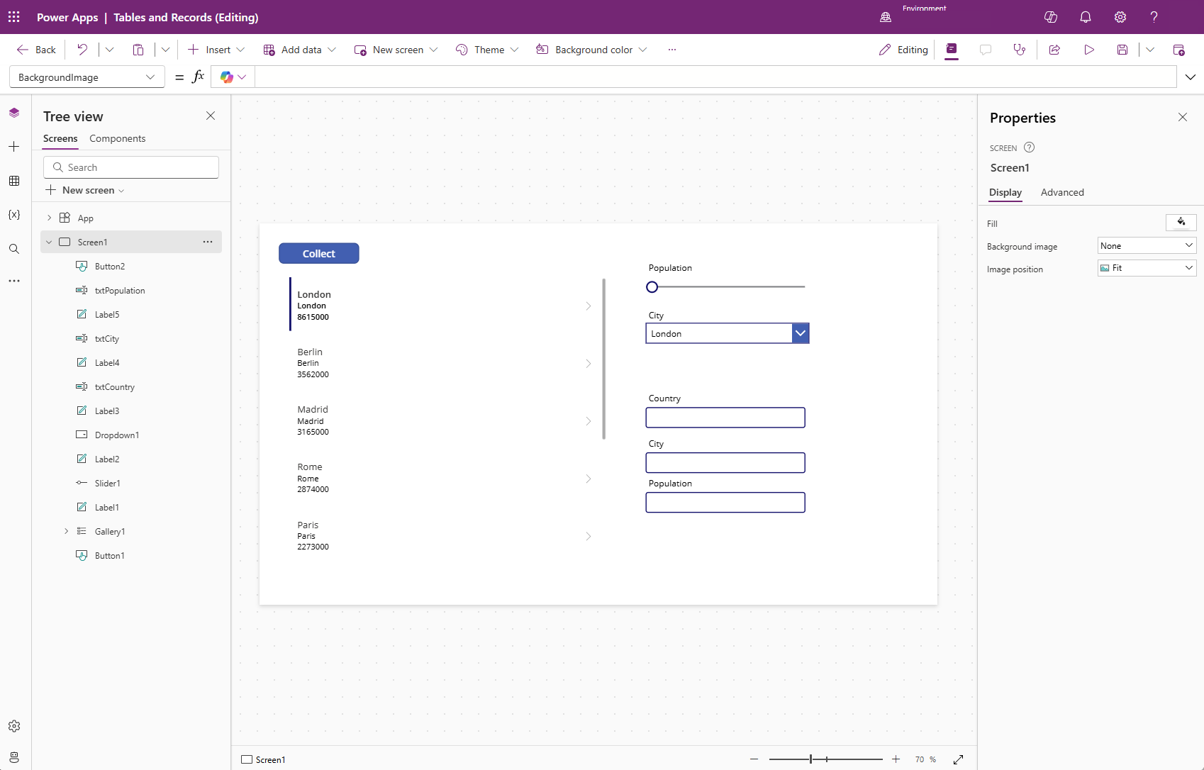 ClearCollect(CityPopulations, {City:"London", Country:"United Kingdom", Population:8615000}, {City:"Berlin", Country:"Germany", Population:3562000}, {City:"Madrid", Country:"Spain", Population:3165000}, {City:"Rome", Country:"Italy", Population:2874000}, {City:"Paris", Country:"France", Population:2273000}, {City:"Hamburg", Country:"Germany", Population:1760000}, {City:"Barcelona", Country:"Spain", Population:1602000}, {City:"Munich", Country:"Germany", Population:1494000}, {City:"Milan", Country:"Italy", Population:1344000})Tenere premuto il tasto ALT mentre si fa clic sul controllo Pulsante. In questo modo verrà creata una raccolta denominata "CityPopulations" e verranno archiviati tutti i record precedenti nella raccolta. Aggiornare la proprietà Text del pulsante impostandola su "Collect".