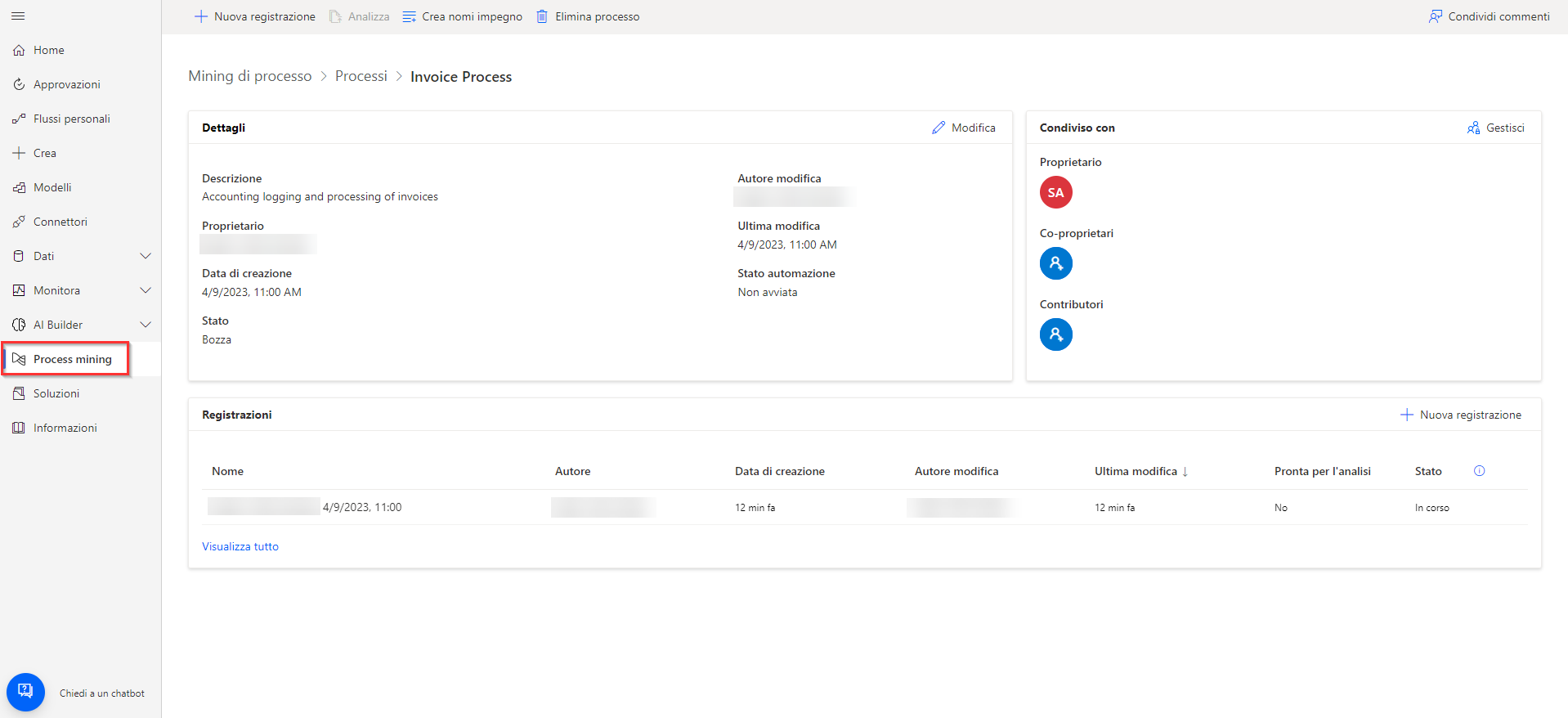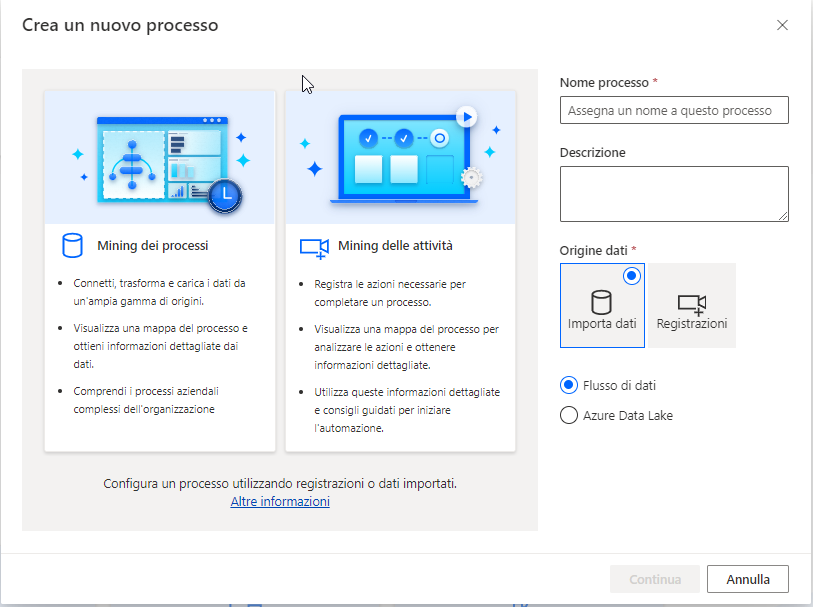 Se sono già presenti processi esistenti nel mining dei processi, verranno visualizzati nelle opzioni Crea nuovo processo.