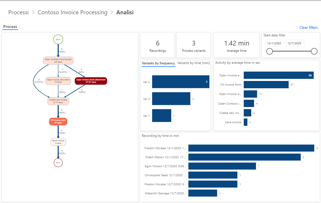 In questa registrazione la compilazione del modulo di fatturazione ha richiesto più tempo rispetto alle altre registrazioni. L'intero processo ha in effetti richiesto più di due minuti e ha rappresentato pertanto l'esecuzione più lunga. Ciò è probabilmente dovuto al fatto che l'utente ha digitato le informazioni anziché copiare e incollare i dati oppure che il processo potrebbe essere un outlier. Indipendentemente dal motivo, si stanno acquisendo informazioni sul processo.