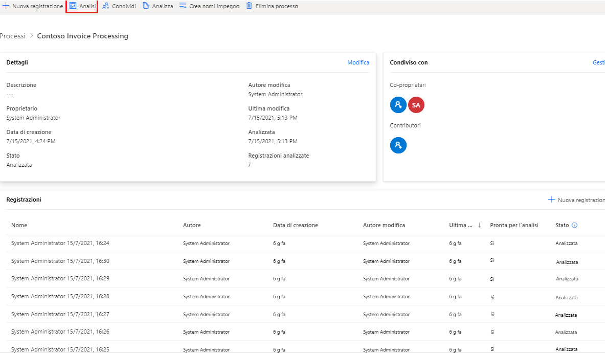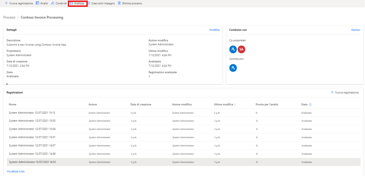 Una volta che si avranno a disposizione alcune registrazioni, dopo averle raggruppate in azioni, sarà possibile analizzare il processo. Sebbene sia possibile analizzare un processo con solo due registrazioni, l'analisi diventa più utile man mano che aumenta il numero di registrazioni. Dopo aver preparato le registrazioni, passare al processo e selezionare Analizza.