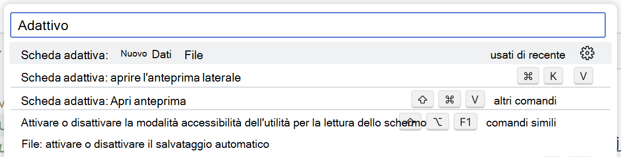 >Adaptiveper trovare i comandi correlati all'uso delle schede adattive.Nell'elenco scegliere Scheda adattiva: Nuovo file di dati. Visual Studio Code crea un nuovo file denominato dish.data.json.