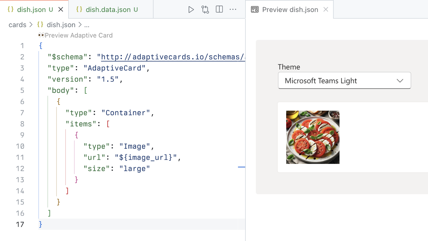{ "$schema": "http://adaptivecards.io/schemas/adaptive-card.json", "type": "AdaptiveCard", "version": "1.5", "body": [ { "type": "Container", "items": [ { "type": "Image", "url": "${image_url}", "size": "large" }, { "type": "TextBlock", "text": "${name}", "weight": "Bolder" }, { "type": "TextBlock", "text": "${description}", "wrap": true }, { "type": "TextBlock", "text": "Allergens: ${if(count(allergens) > 0, join(allergens, ', '), 'none')}", "weight": "Lighter" }, { "type": "TextBlock", "text": "**Price:** €${formatNumber(price, 2)}", "weight": "Lighter", "spacing": "None" } ] } ] }Si noti che per visualizzare gli allergeni si usa una funzione per unire gli allergeni in una stringa. Se un piatto non ha allergeni, non ne viene visualizzato alcuno. Per assicurarsi che i prezzi siano formattati correttamente, si usa la funzione formatNumber che consente di specificare il numero di decimali da visualizzare nella scheda.