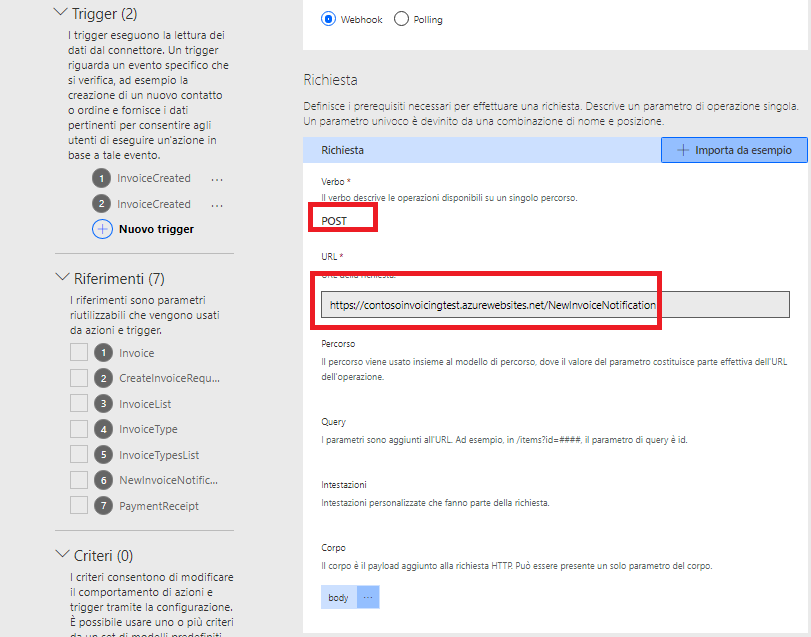 La definizione del trigger deve includere un metodo POST usato per registrare un webhook. La definizione è simile a quella delle azioni.