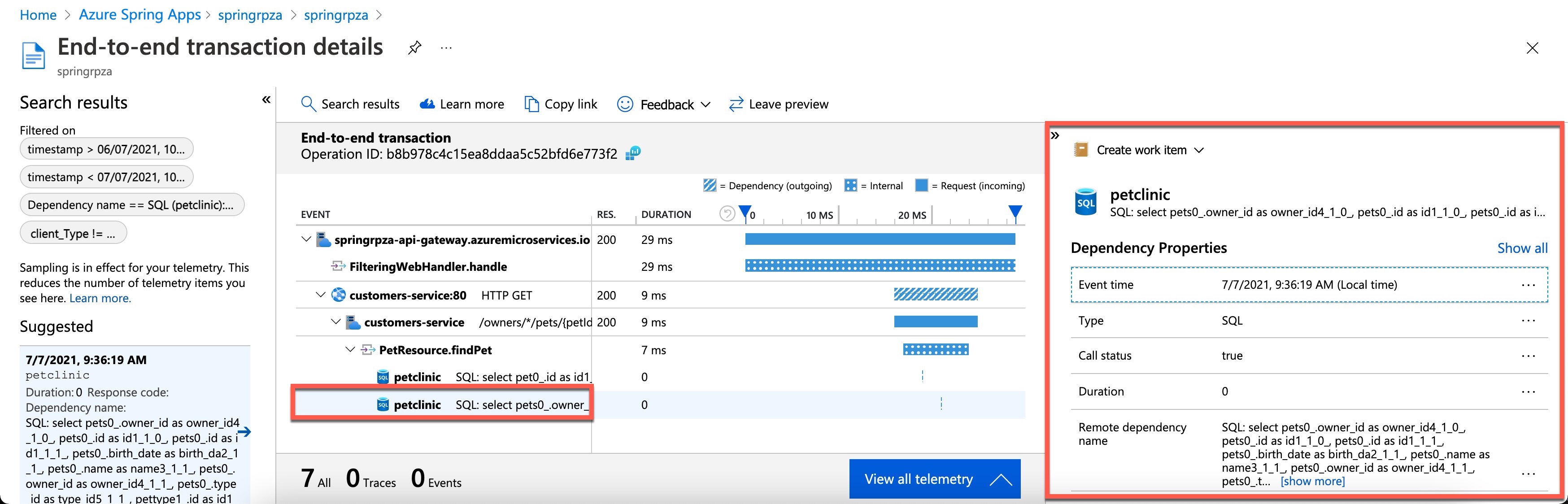Infine, nella visualizzazione Dettagli delle transazioni end-to-end selezionare l'istruzione SQL per visualizzare la transazione SQL di esempio:
