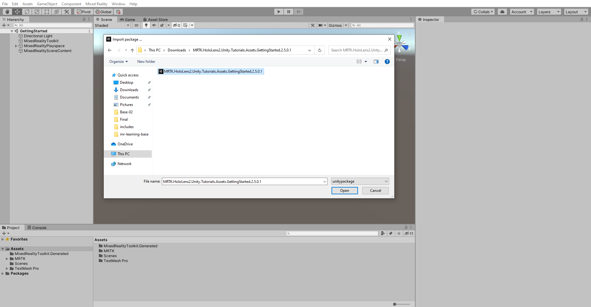 In Importa pacchetto, selezionare il MRTK.HoloLens2.Unity.Tutorials.Assets.GettingStarted.3.0.0 unitypackage che hai scaricato e quindi selezionare Apri.