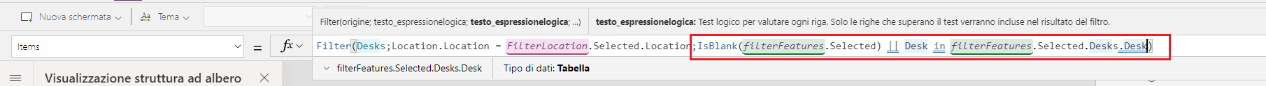 Filter(Desks,Location.Location = FilterLocation.Selected.Location,IsBlank(filterFeatures.Selected) || Desk in filterFeatures.Selected.Desks.Desk)Salvare le modifiche (se necessario).