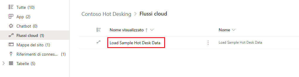 Selezionare Flussi cloud, quindi scegliere e aprire il flusso Load Sample Hot Desk Data.
