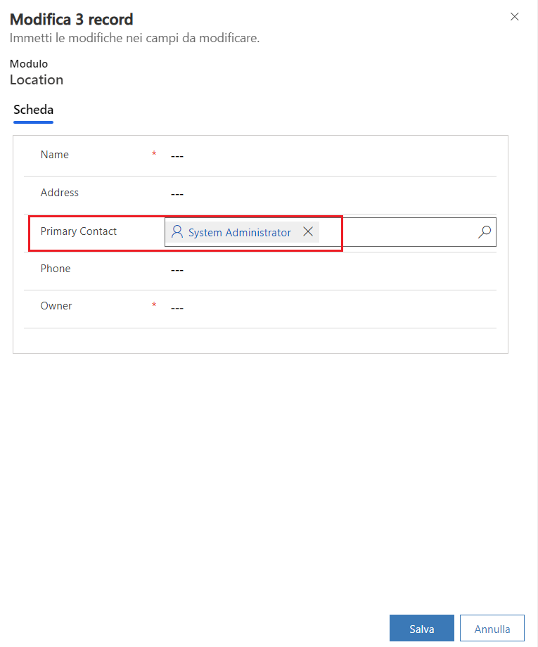 Selezionare un utente nel campo Primary Contact, quindi scegliere Salva.