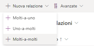 Selezionare l'opzione Relazioni nel riquadro Schema. Selezionare + Nuova relazione, quindi selezionare Molti-a-molti.