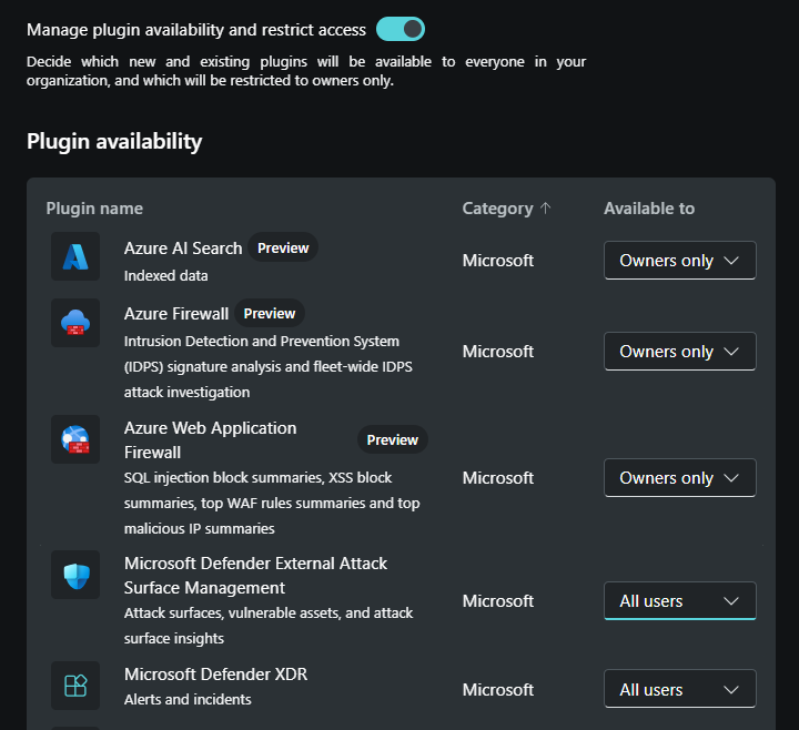- Plug-in - Esempi includono: Microsoft Defender XDR, Microsoft Threat Intelligence e Linguaggio naturale per KQL per la rilevazione avanzata.