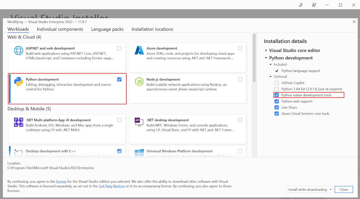 Se non viene visualizzata l'opzione Debug python/nativo , è prima necessario installare gli strumenti di sviluppo nativi Python usando il programma di installazione di Visual Studio. L'opzione di debug nativo è disponibile nell'ambito di sviluppo Python. Per altre informazioni, vedere Installare il supporto python in Visual Studio.