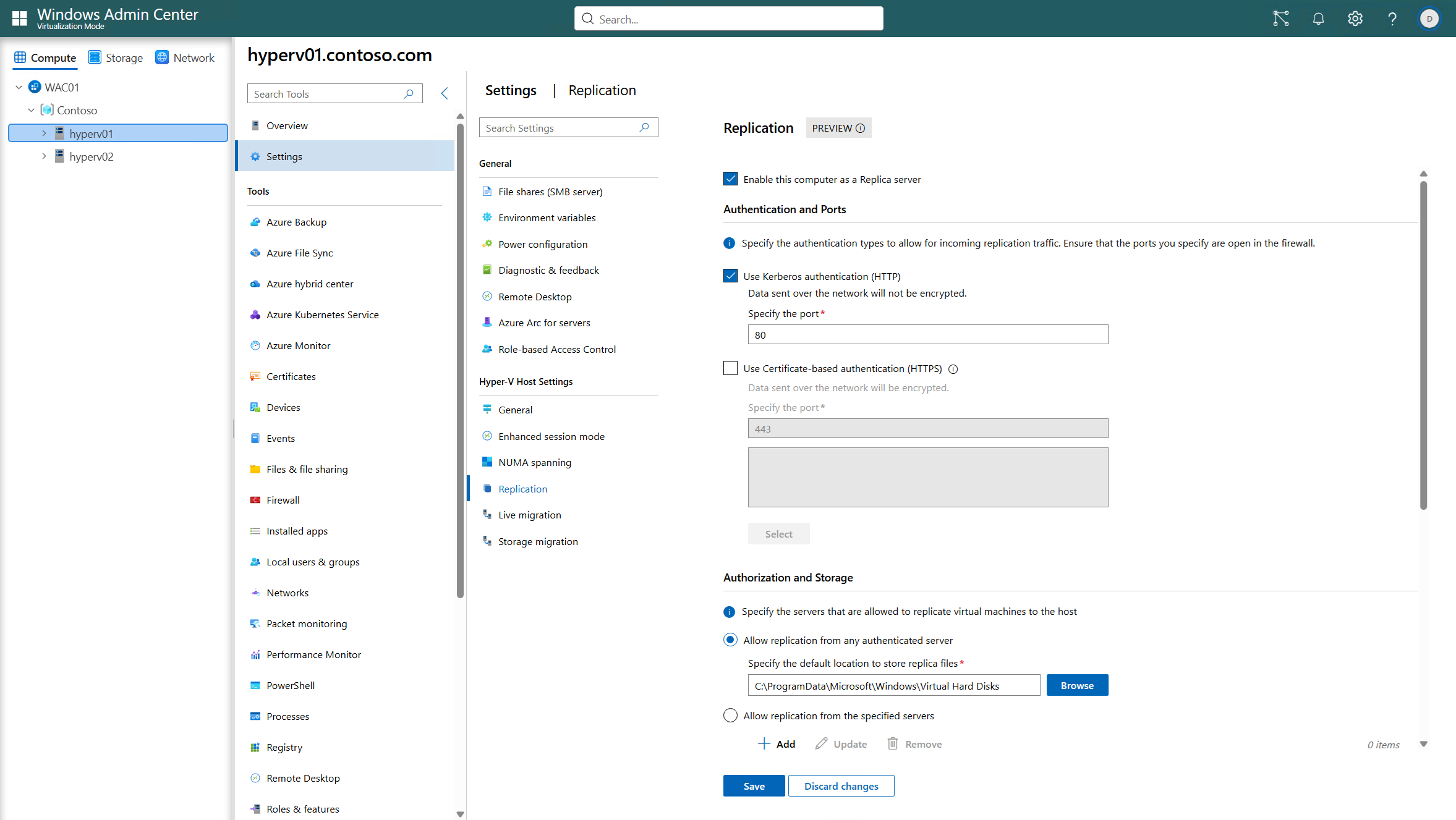 Per consentire la replica tra cluster e host primario e di replica, il traffico deve attraversare Windows Firewall (o qualsiasi altro firewall di terze parti). Quando si installa il ruolo Hyper-V in ogni host, Windows Firewall crea eccezioni per HTTP (80) e HTTPS (443), ma non le abilita per impostazione predefinita. È necessario abilitare le regole appropriate per tutti gli host riceventi.