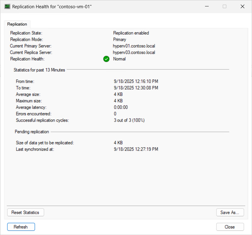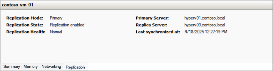 contoso-vm-01 Replicating Normal Primary 300 hyperv01 cluster02rep 80 Kerberos Simple