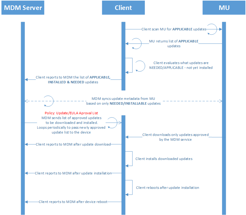 Il Microsoft Update Catalog contiene molti aggiornamenti che non sono necessari per i dispositivi gestiti da MDM. Include aggiornamenti per il software legacy, come gli aggiornamenti dei server, i sistemi operativi desktop di livello inferiore, le app legacy e un numero elevato di driver. È consigliabile che MDM utilizzi il protocollo Server-Server di sincronizzazione per ottenere i metadati di aggiornamento per gli aggiornamenti segnalati dal client.