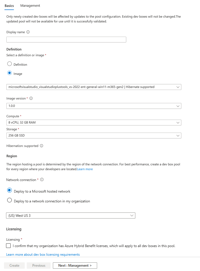 2. 開発ボックスに使うデプロイ リージョンを選びます。 最適なユーザー エクスペリエンスを実現するために、想定する開発ボックス ユーザーに近いリージョンを選びます。ライセンス このプール内の開発ボックスに適用する Azure ハイブリッド特典ライセンスが組織にあることを確認するには、このチェック ボックスをオンにします。 [ 管理 ] タブで、次の値を入力します。